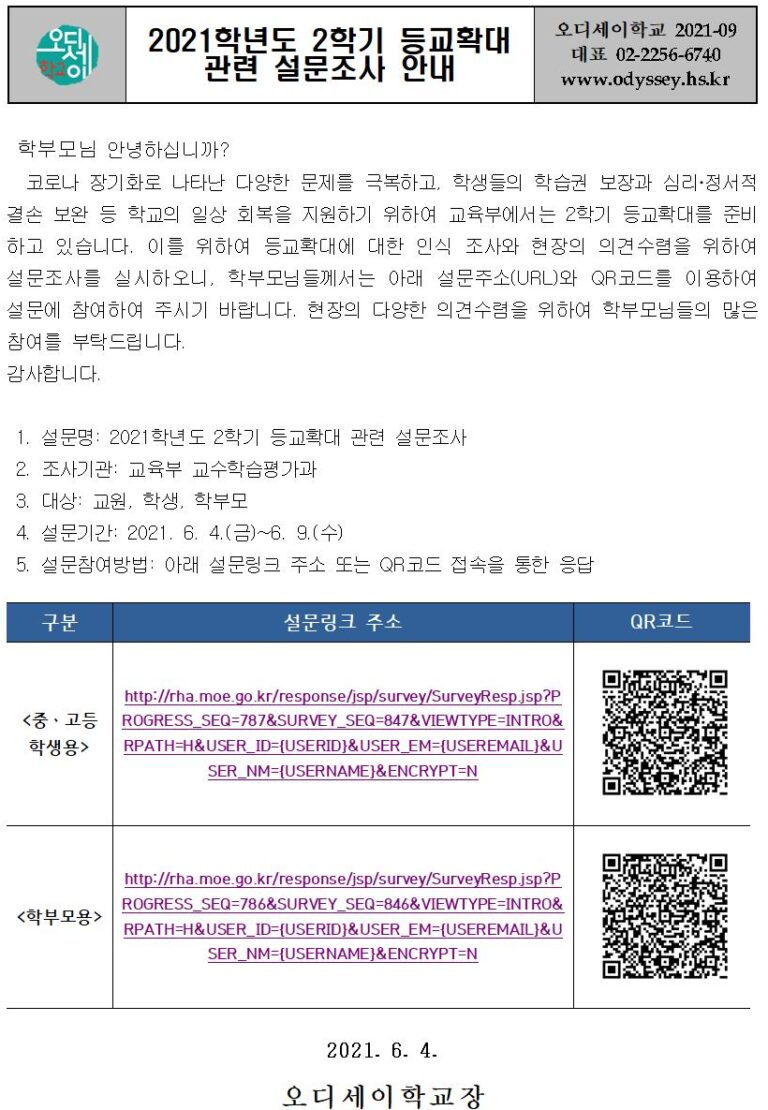 2021학년도 2학기 등교확대 관련 설문조사 안내